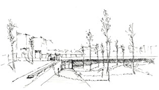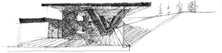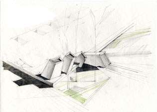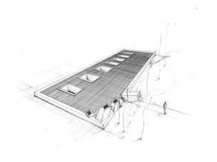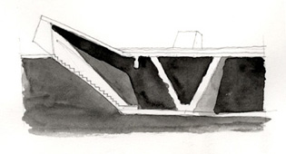 E3_TANATORIO DE LEÓN La experiencia del tanatorio de León ofreció otras conclusiones. Prácticamente ningún estudiante se cuidó de la relación del edificio con el contexto, un hecho relevante ya que la ubicación de un tanatorio en una zona residencial no era una empresa fácil para el diseñador, de aquí la inteligencia de la propuesta: la lámina de agua sobre su cubierta opera como un espejo, desvirtuando la mirada hacia su interior, puesto que el conjunto adquiere la apariencia de una intervención paisajista con una entrada en talud abierta hacia los caminos que bordean el río. Dada su longitud puede entenderse que las secciones no fueran exitosas, a pesar de la insistencia de los profesores en que el conjunto se dividiese en tres sectores a los efectos de explicar la sección. Echamos en falta asuntos como este a debatir la sutileza de la representación, que debiera ser un asunto compartido por todas las materias que tienen por objeto materializar una idea y comunicarla. Queremos decir con ello que una breve descripción del conjunto habría ayudado a comprender mejor la propuesta arquitectónica y hubiera constituido un buen inicio para explicar el edificio.