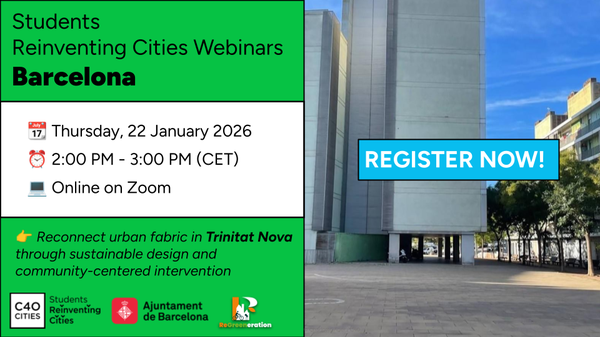 C40 és una xarxa global de gairebé 100 ciutats líders mundials unides a l'acció per fer front a la crisi climàtica. Com a ciutat C40, Barcelona es compromet a utilitzar un enfocament inclusiu, basat en la ciència i la col·laboració per reduir la nostra quota d'emissions a la meitat per al 2030, ajudar el món a limitar l'escalfament global a 1,5 °C i construir comunitats sanes, equitatives i resilients. Aquests compromisos són exactament la raó per la qual Barcelona, juntament amb 16 ciutats de tot el món, s’uneix a Students Reinventing Cities; junts, estem cridant els joves a transformar les zones urbanes en barris més verds, centrats en les persones i resilients al clima.
